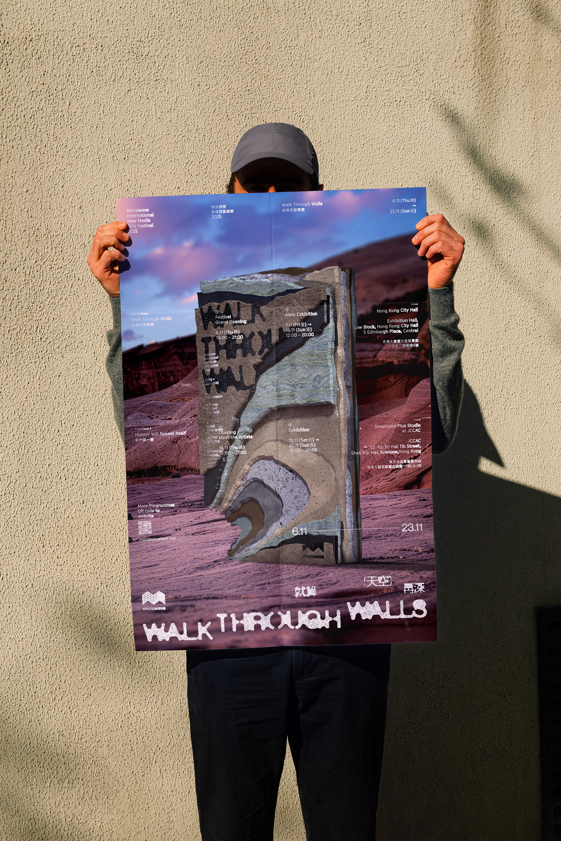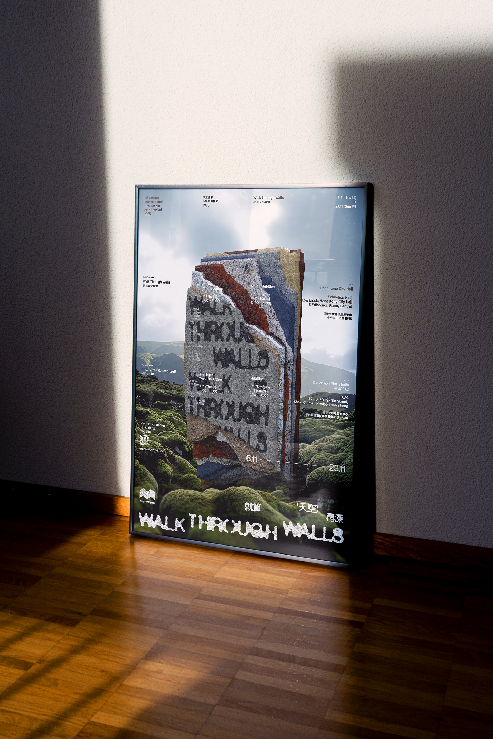 This work uses “walls” as a metaphor for memory, revealing how time leaves its marks through layers of structure. Memories may appear to fade, erode, or slip away with the passing years, yet the moment one moves gently through their cracks, those seemingly lost fragments quietly resurface. Visually, the piece is built from walls of different textures, eras, and lighting conditions, creating a cinematic atmosphere suspended between dream and reality. Soft light, deep perspective, and subtle shifts in tone evoke an image that feels like a dream being recalled—blurred yet tangible, distant yet intimately close. As the main visual for the Microwave International New Media Arts Festival 2025, this design extends the festival’s spirit of “thinking through images.” It invites viewers to reposition themselves within the gaps between city, memory, and individual consciousness. Rather than nostalgia, the work speaks of passage—an act of crossing.